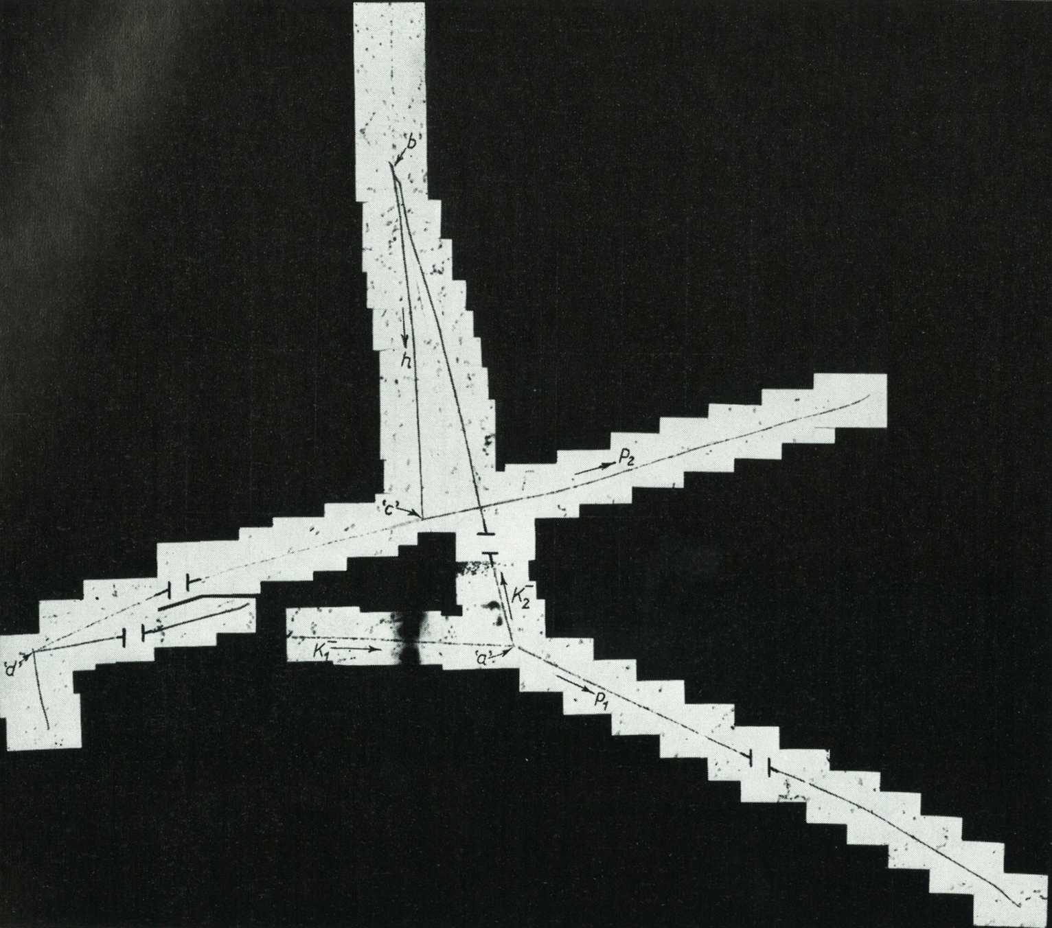 Bottom picture (1953) : This event provided the first evidence for the direct production of Kaon in nuclear disintegrations. The Kaon emerges from a nuclear encounter in the emulsion at the point O, and stops in the emulsion at the point P, its total range being ~ 7 mm.